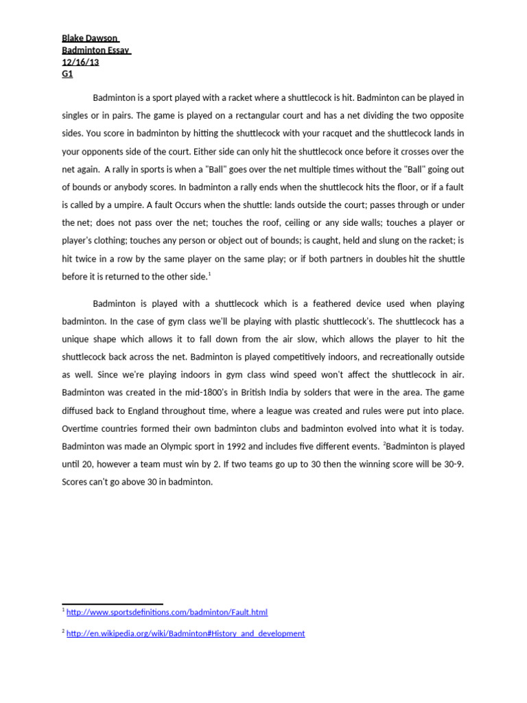 Essay on badminton