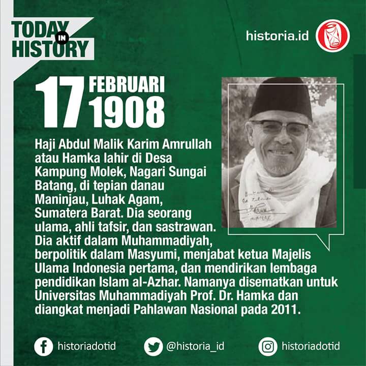 Historia.id : “17 Februari 1908 Haji Abdul Malik Karim Amrullah atau Hamka lahir di Desa Kampung Molek, Nagari Sungai Batang, di tepian danau Maninjau, Luhak Agam, Sumatera Barat. Dia seorang ulama, ahli