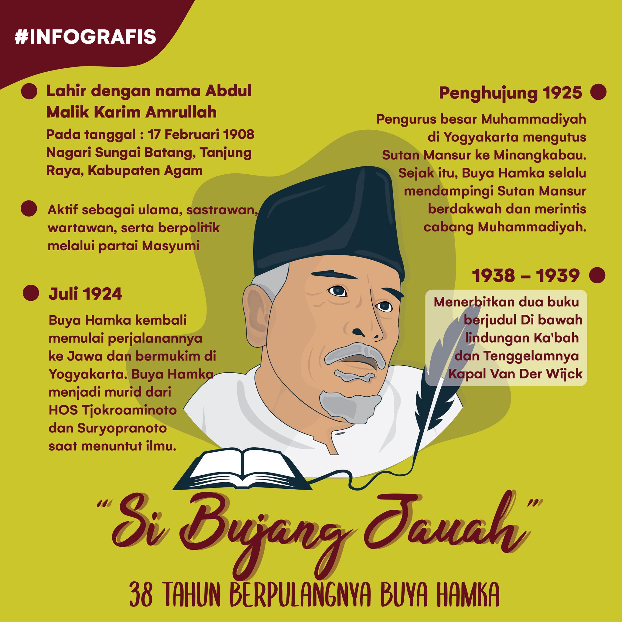 Historia.id : “17 Februari 1908 Haji Abdul Malik Karim Amrullah atau Hamka lahir di Desa Kampung Molek, Nagari Sungai Batang, di tepian danau Maninjau, Luhak Agam, Sumatera Barat. Dia seorang ulama, ahli