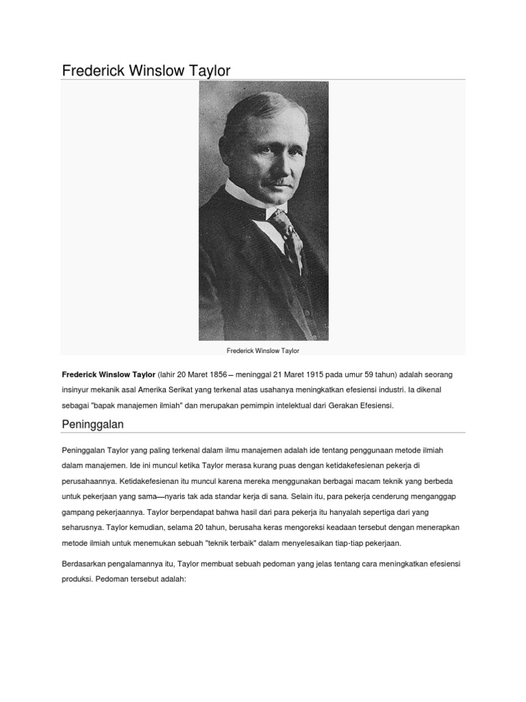 Tokoh Manajemen: Frederick Winslow Taylor (1856-1915) | Pendidikan Ekonomi