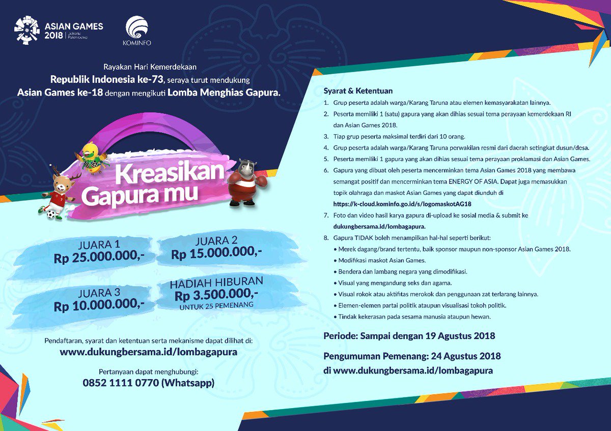 KOTA BEKASI | #75TahunJabar : “Ayo rayakan Hari Kemerdekaan Republik Indonesia ke-73, seraya turut mendukung Asian Games ke-18 dengan mengikuti Lomba Menghias Gapura! Peserta dapat mengunduh aset visual Asian Games dari