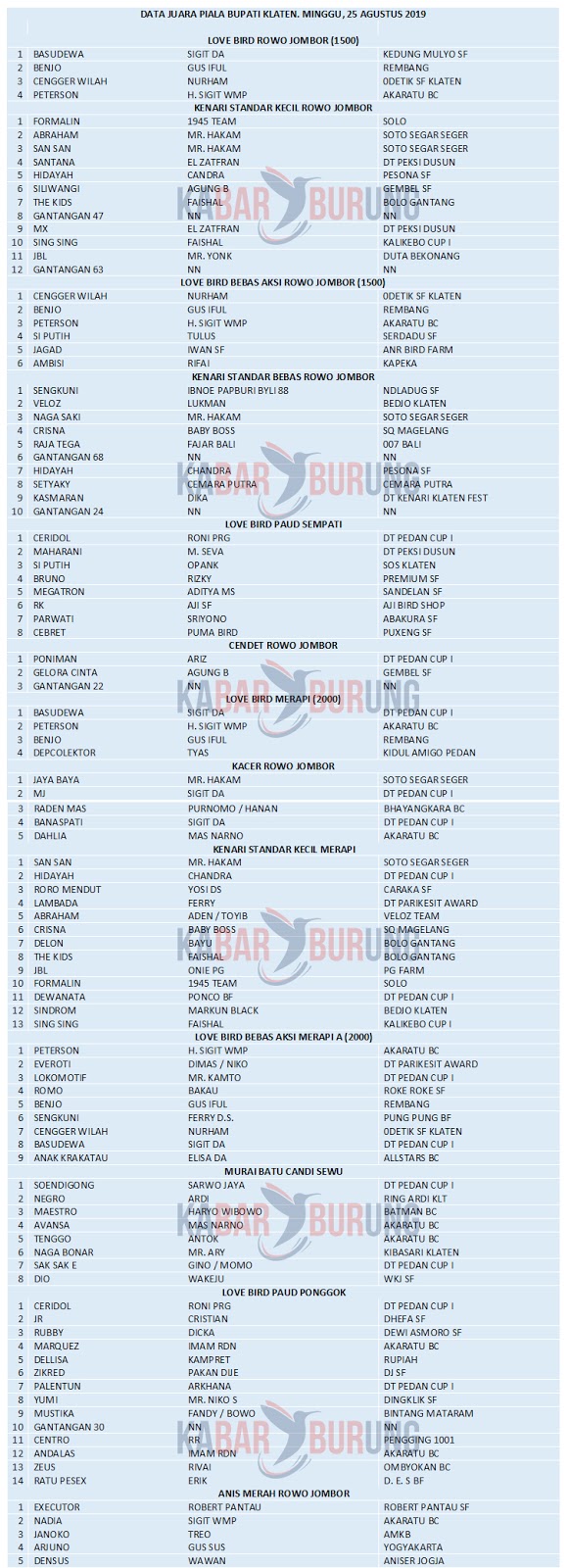 DAFTAR JUARA : Piala Bupati Klaten - KABAR BURUNG