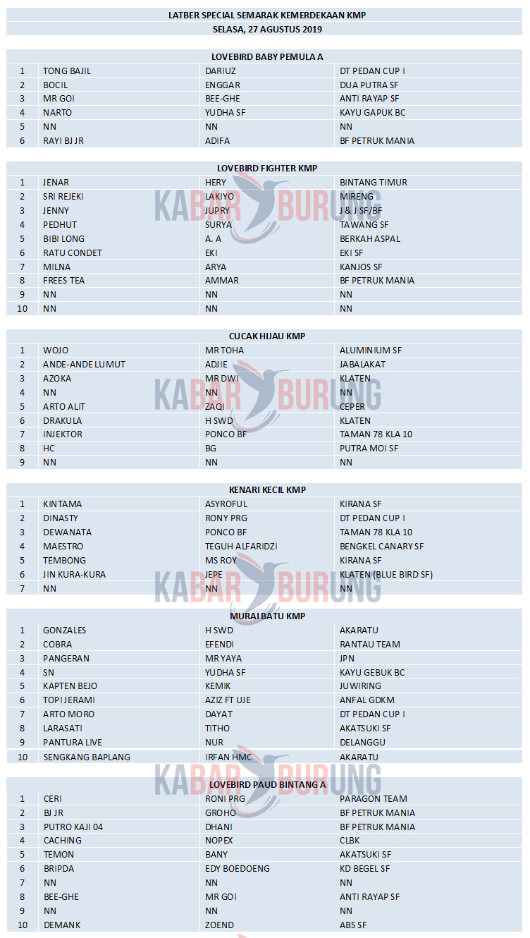 DAFTAR JUARA : Semarak Kemerdekaan KMP Pedan - KABAR BURUNG