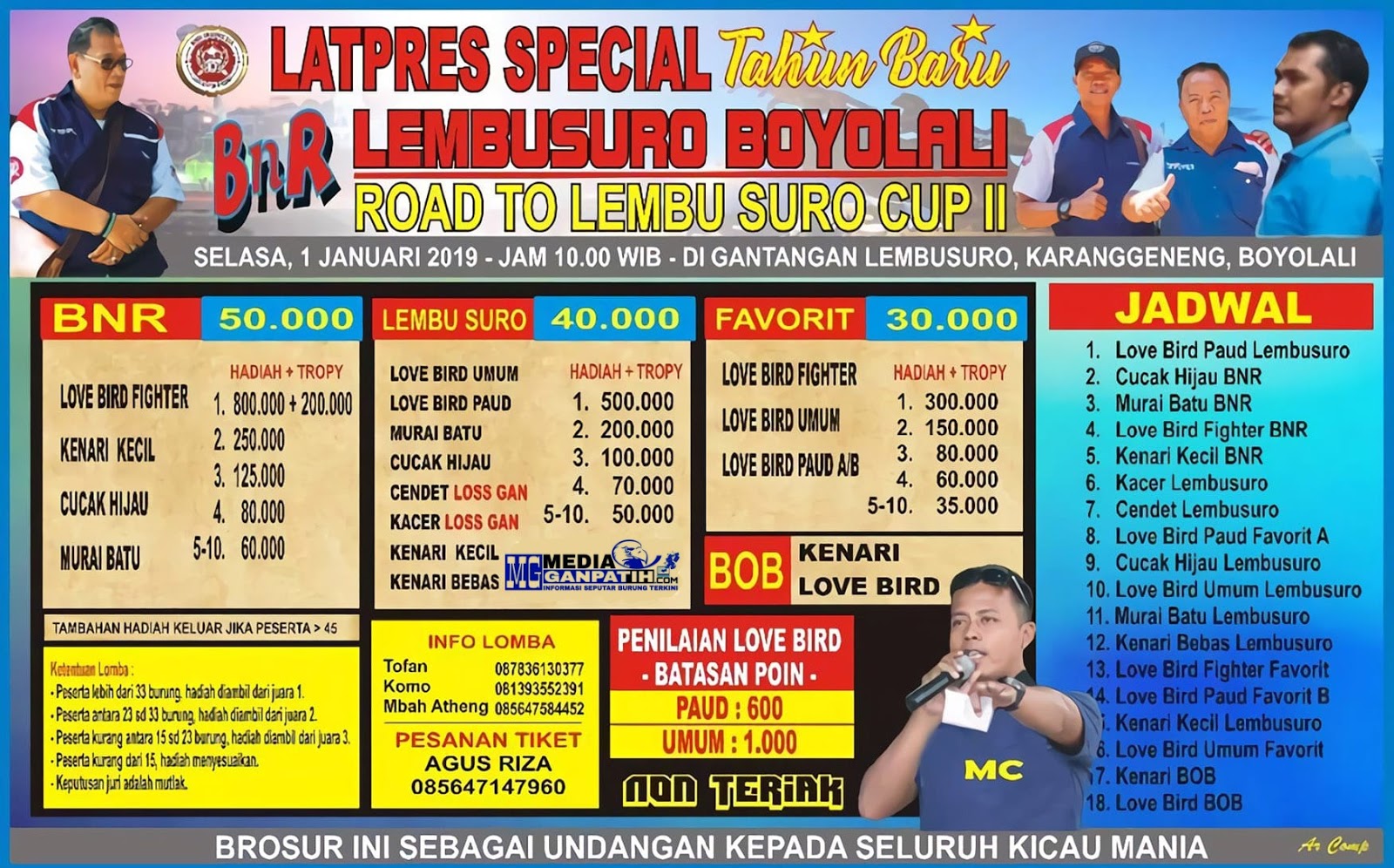 Brosur lomba burung berkicau latpres spesial tahun baru lembu suro boyolali,Selasa,1 januari 2019