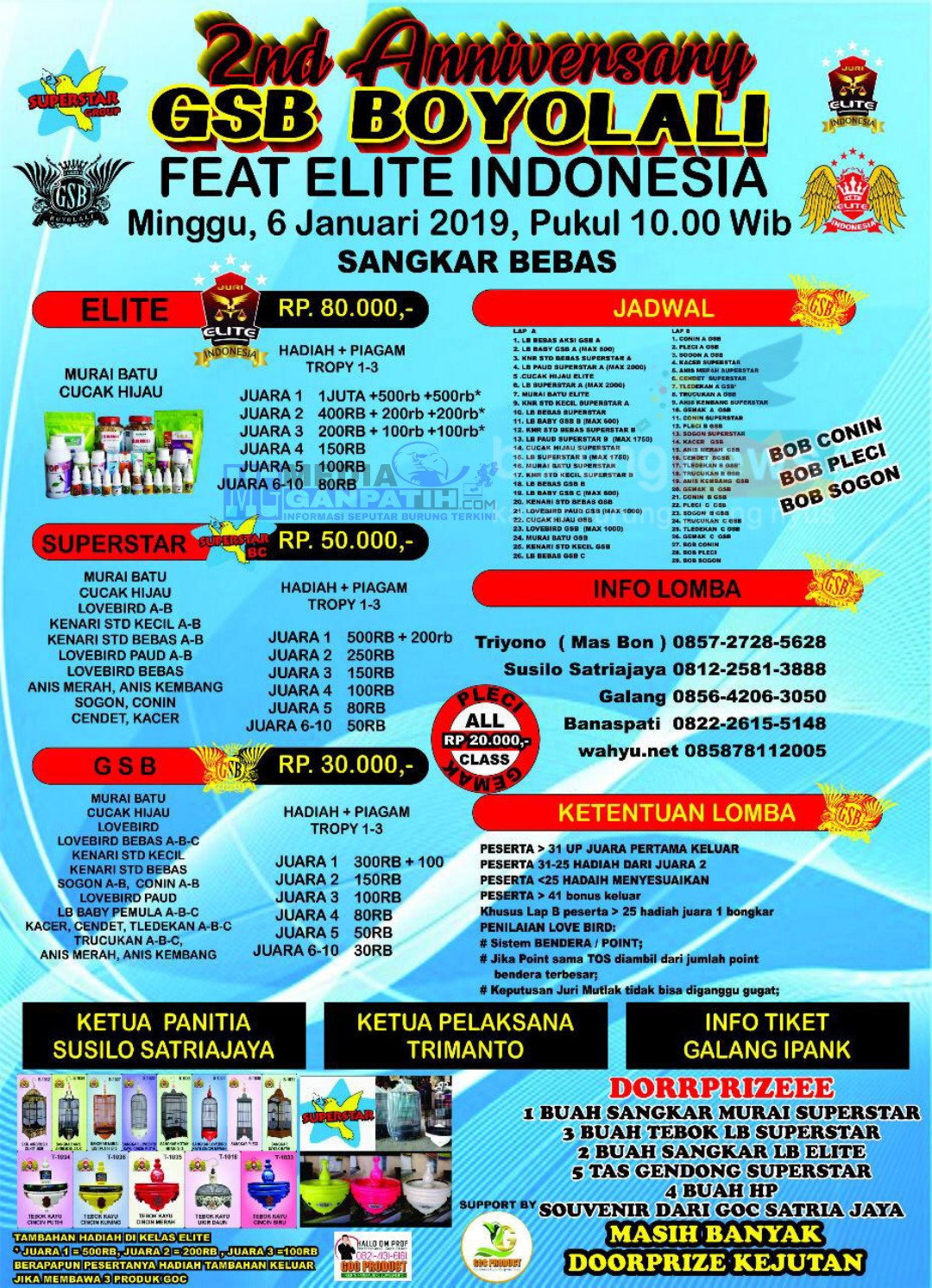 Brosur lomba burung anniversary gsb boyolali feat elite indonesia,boyolali,6 januari 2019
