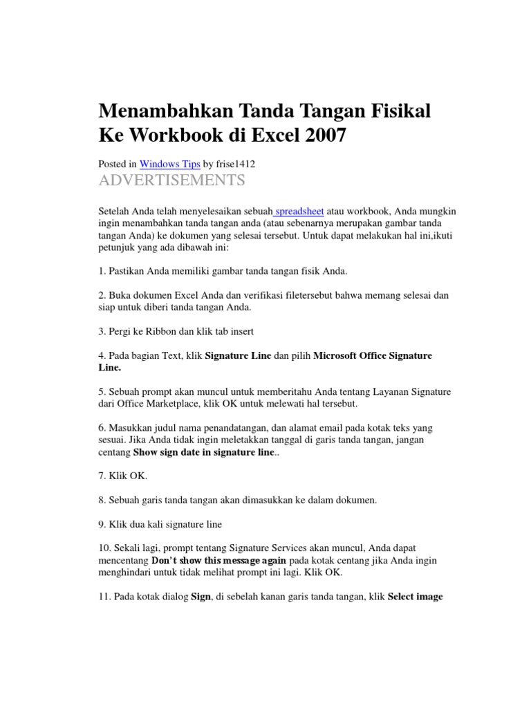 Menambahkan Tanda Tangan Fisikal Ke Workbook Di Excel 2007
