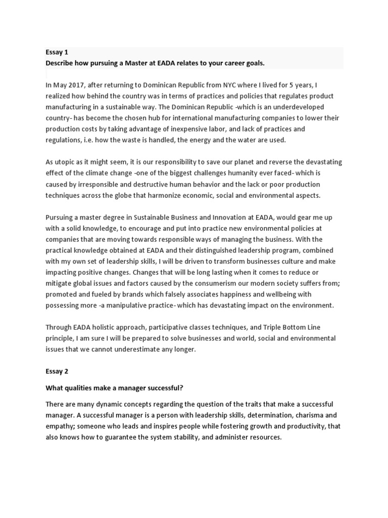 Essay 1 Describe how pursuing a Master at EADA relates to your …