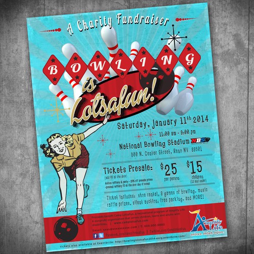 Design a fun american retro bowling event flyer / poster for a …