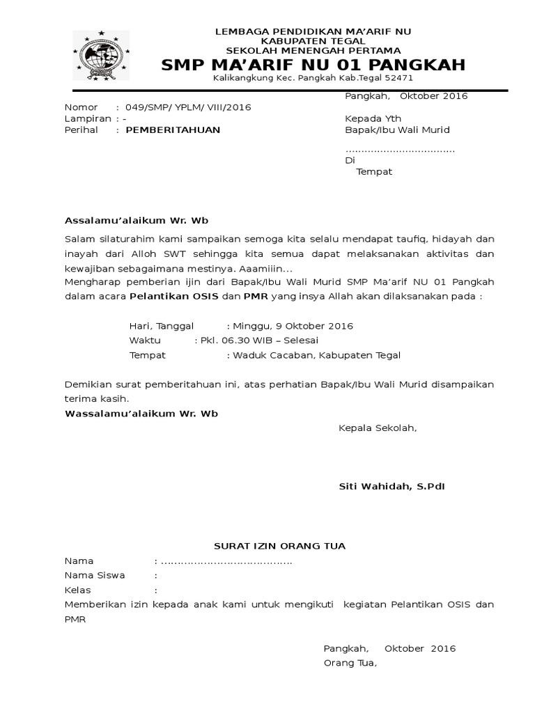 Contoh Surat Izin Orang Tua Untuk Mengikuti Kegiatan Pmr - Contoh …