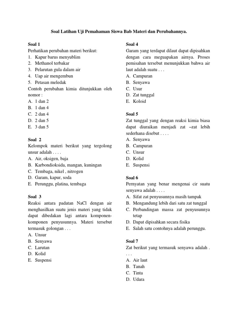 Soal Latihan Uji Pemahaman Siswa Bab Materi Dan Perubahannya