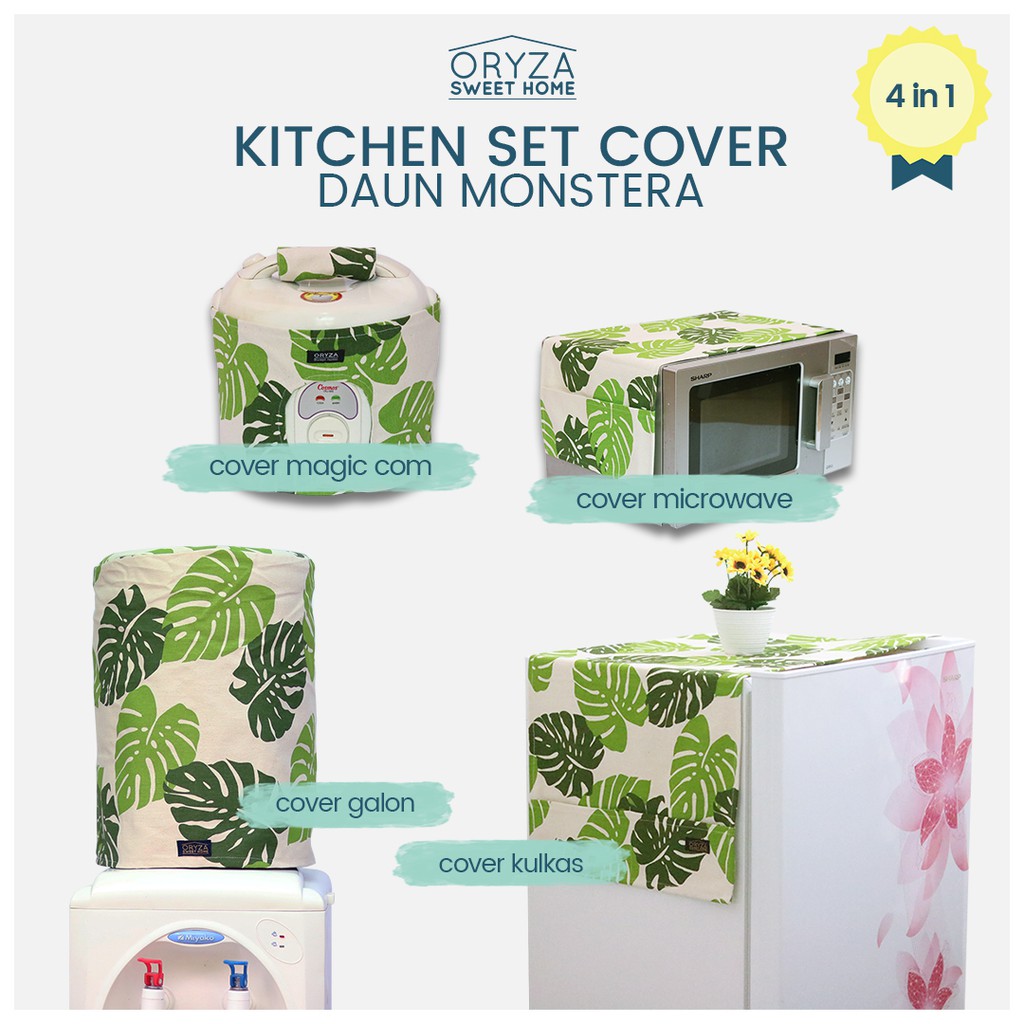Paket Hemat Kitchen Set Cover Tutup Kulkas Sarung Galon Magic Com Oven Microwave - Daun Monstera | Shopee Indonesia