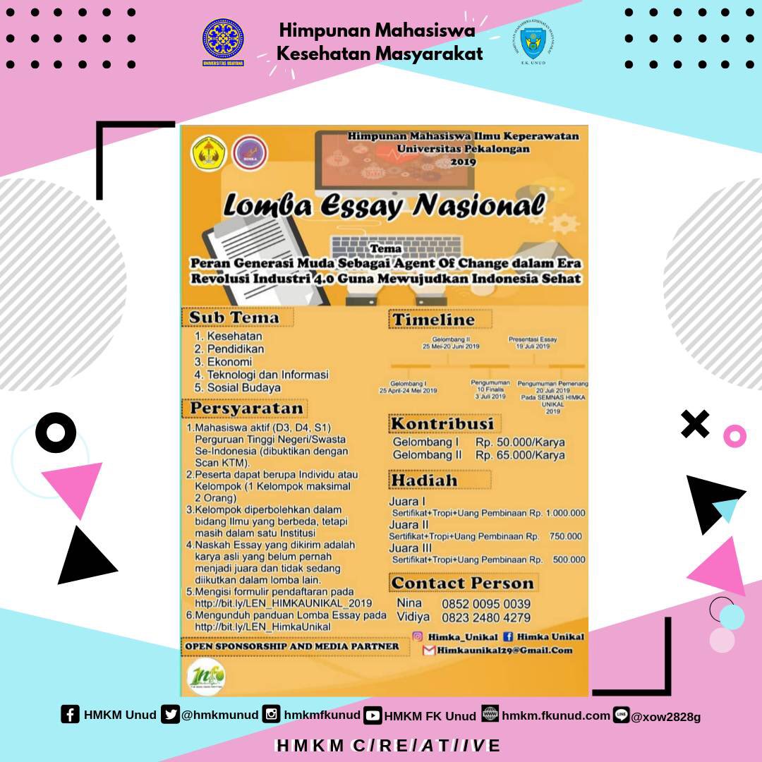 HMKM FK UNUD on Twitter: “3. Lomba Essay Nasional Tema : Peran Generasi Muda Sebagai Agent Of Change dalam Era Revolusi Industri 4.0 Guna Mewujudkan Indonesia Sehat Penyelenggara : HMIK Universitas Pekalongan