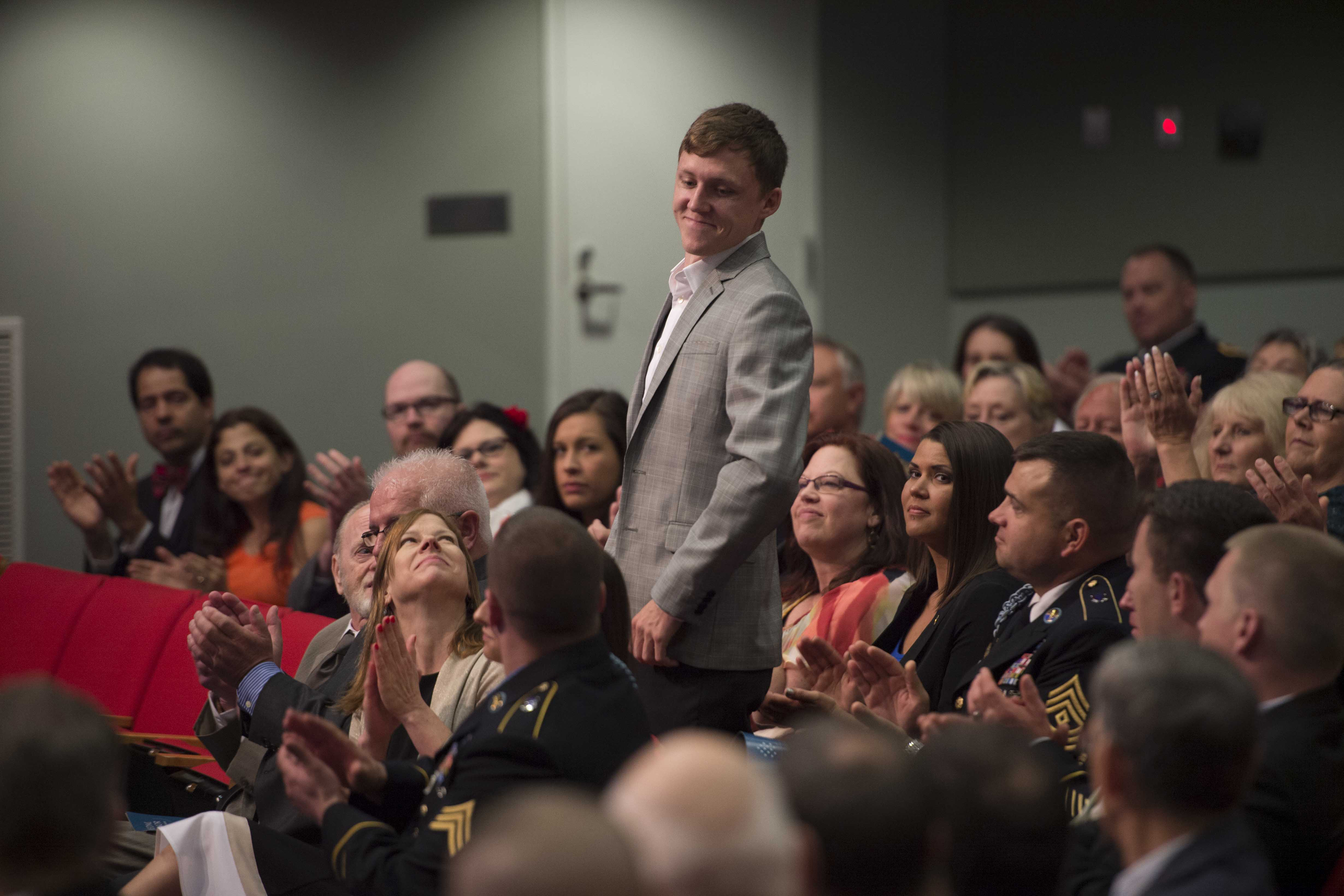 Kain Schilling stands to be recognized during a ceremony to induct …