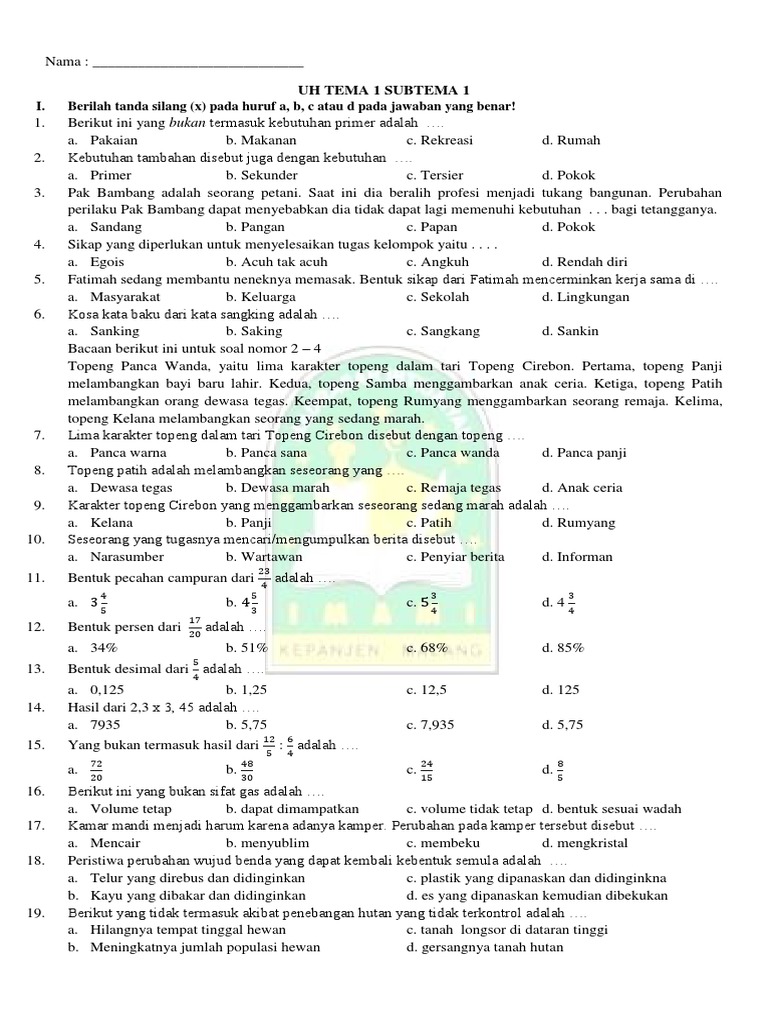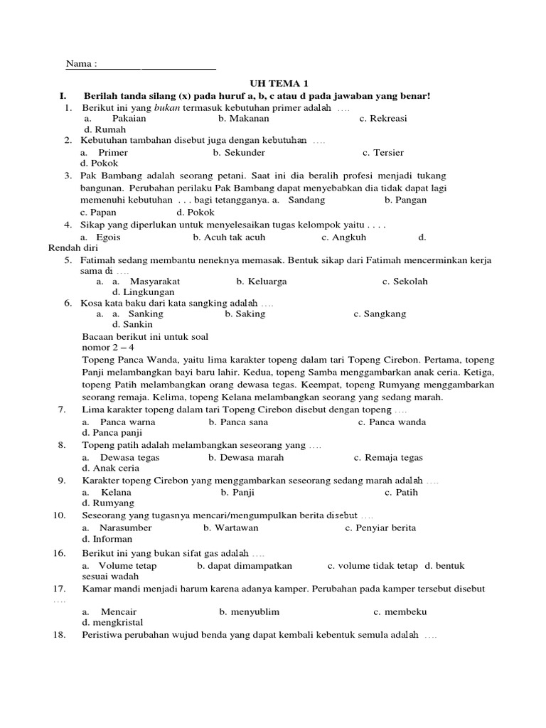 Uh Tema 1 I. Berilah tanda silang (x) pada huruf a, b, c atau d …