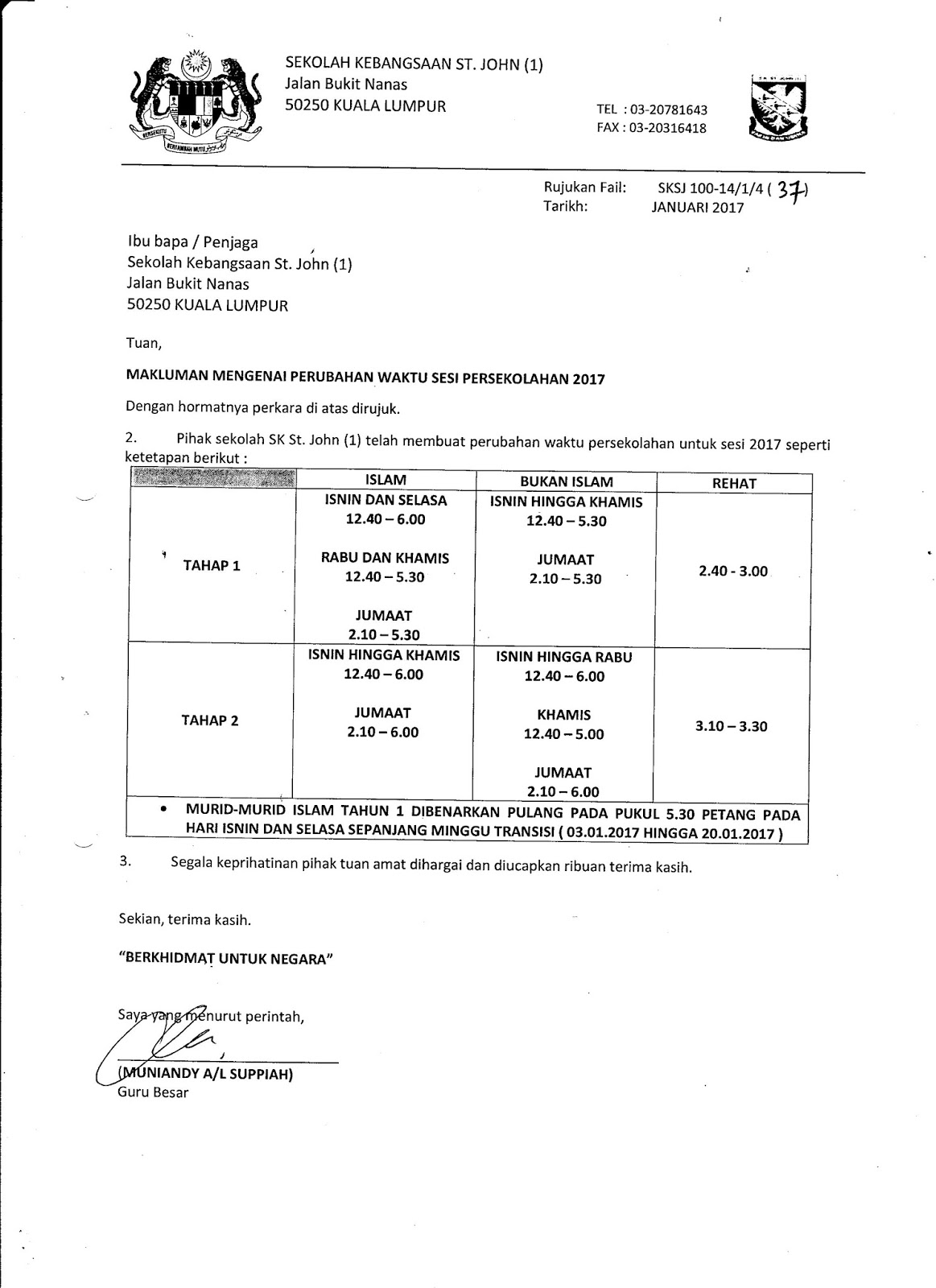 SK ST JOHN 1: PERUBAHAN JADUAL WAKTU SEKOLAH 2017