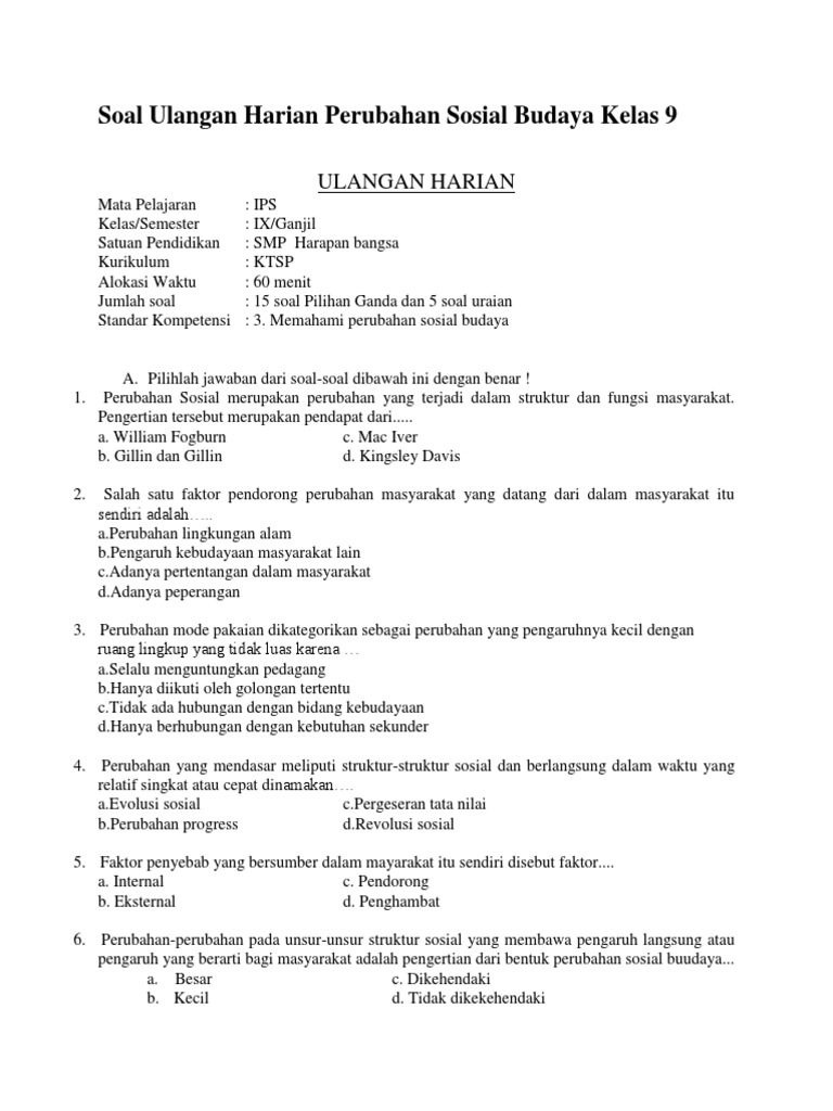 Contoh Soal Perubahan Sosial Budaya Dan Kunci Jawaban - Guru Ilmu …
