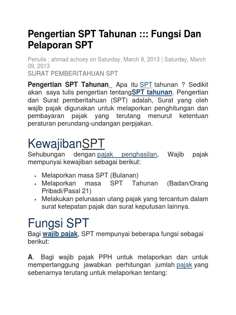 BAB IV PENUTUP 4.1. Ringkasan Pengertian Surat Pemberitahuan (SPT) adalah surat yang oleh Wajib Pajak digunakan untuk melaporkan