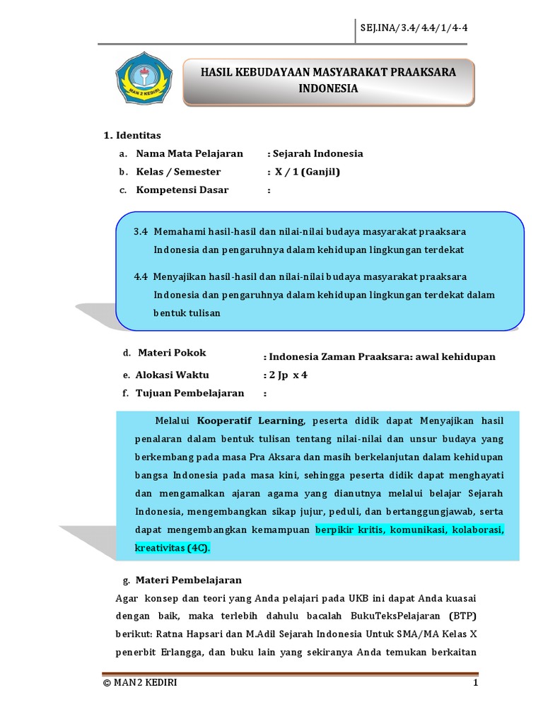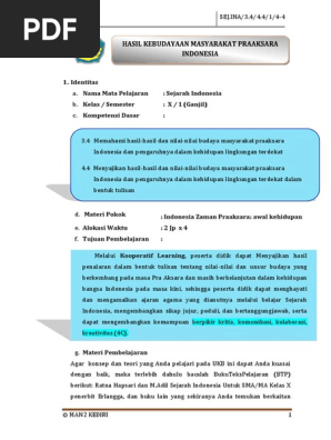 3.4 Memahami hasil-hasil dan nilai-nilai budaya masyarakat praaksara Indonesia dan pengaruhnya dalam kehidupan lingkungan ter