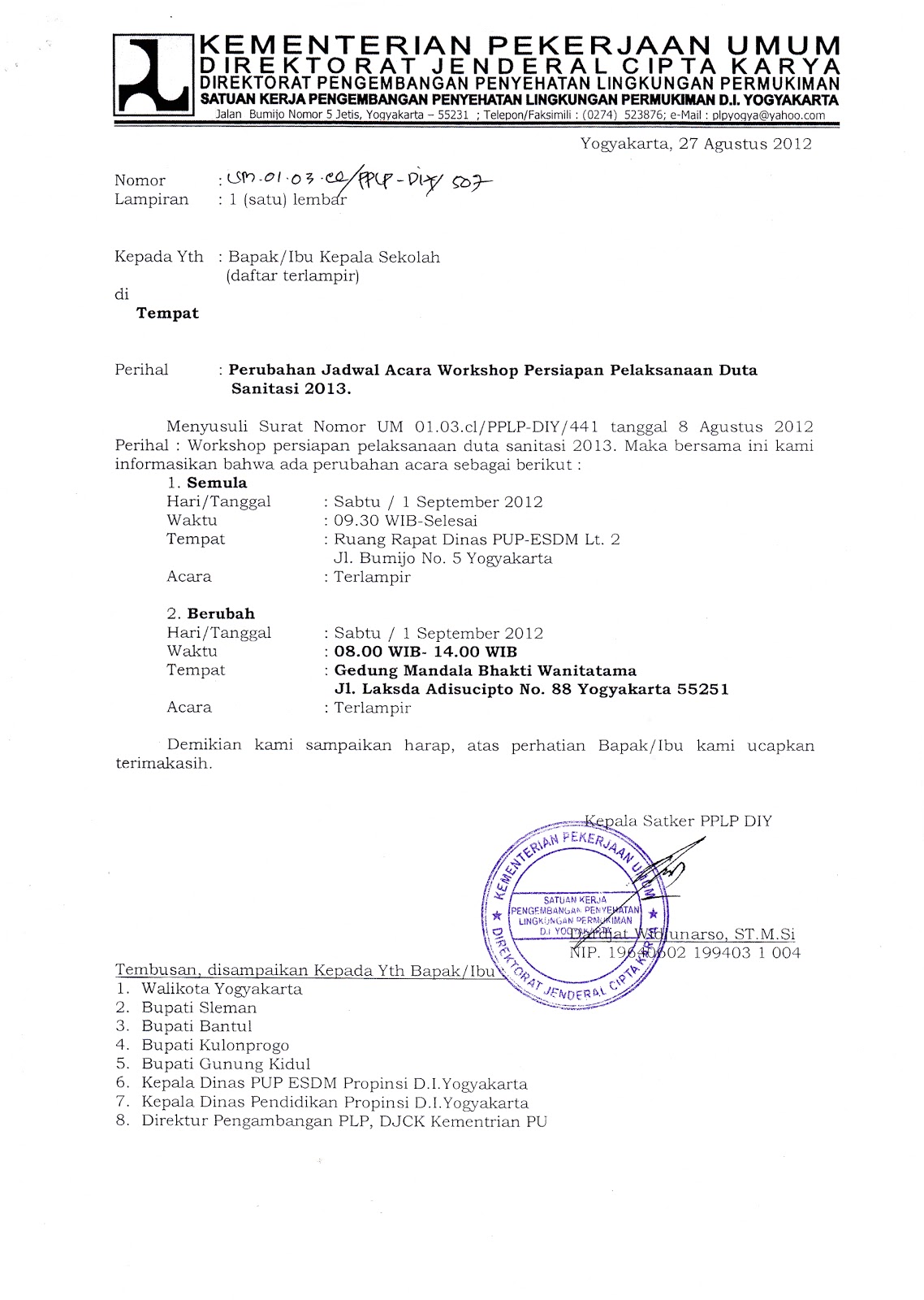 Pemilihan Duta Sanitasi Yogyakarta: Surat Perubahan Jadwal Workshop Persiapan Pelaksanaan Duta Sanitasi 2013