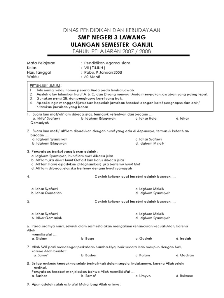 Soal Pai Kelas 7 Semester 1 Dan Kunci Jawaban - Peranti Guru
