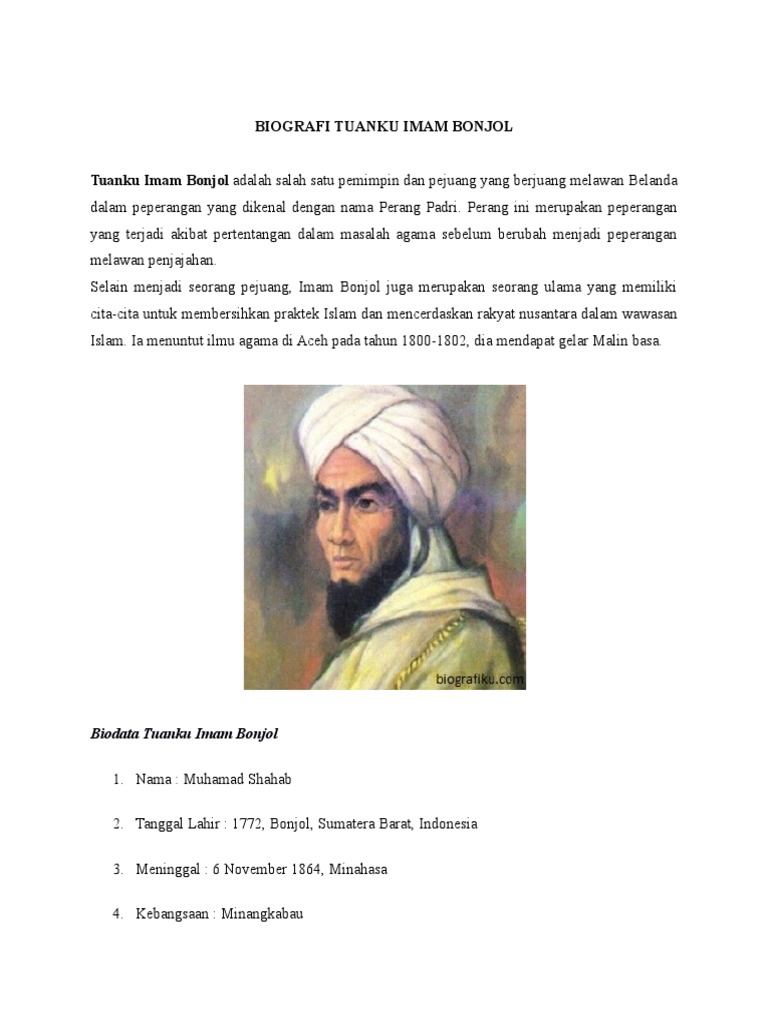 BIOGRAFI_TUANKU_IMAM_BONJOL.doc - BIOGRAFI TUANKU IMAM BONJOL Tuanku Imam Bonjol merupakan seorang ulama,pemimpin dan perjuangan yang berjuang berperang | Course Hero