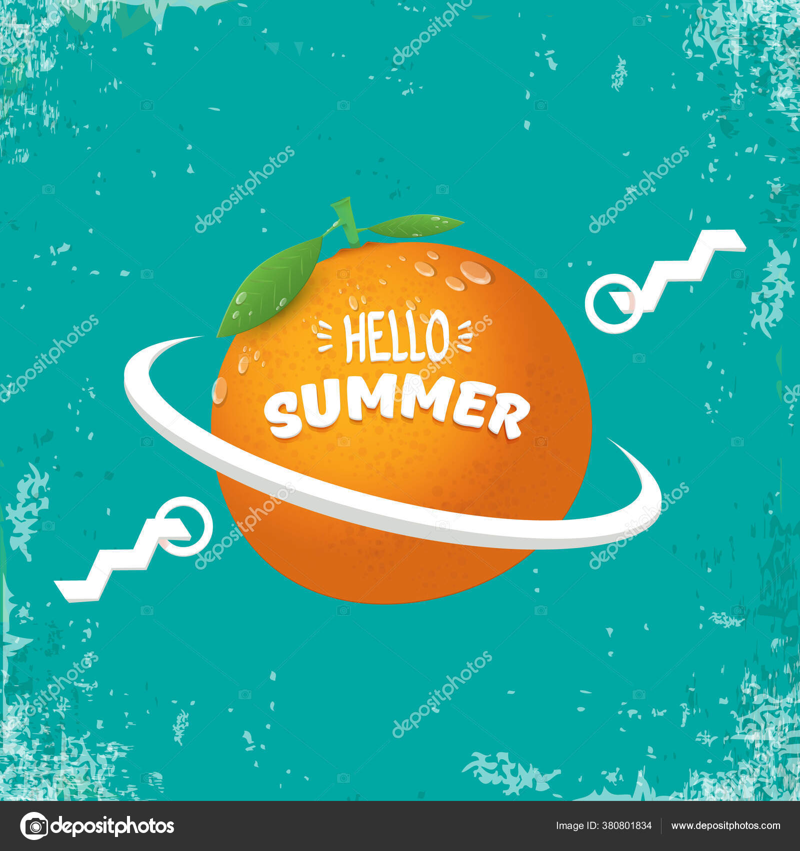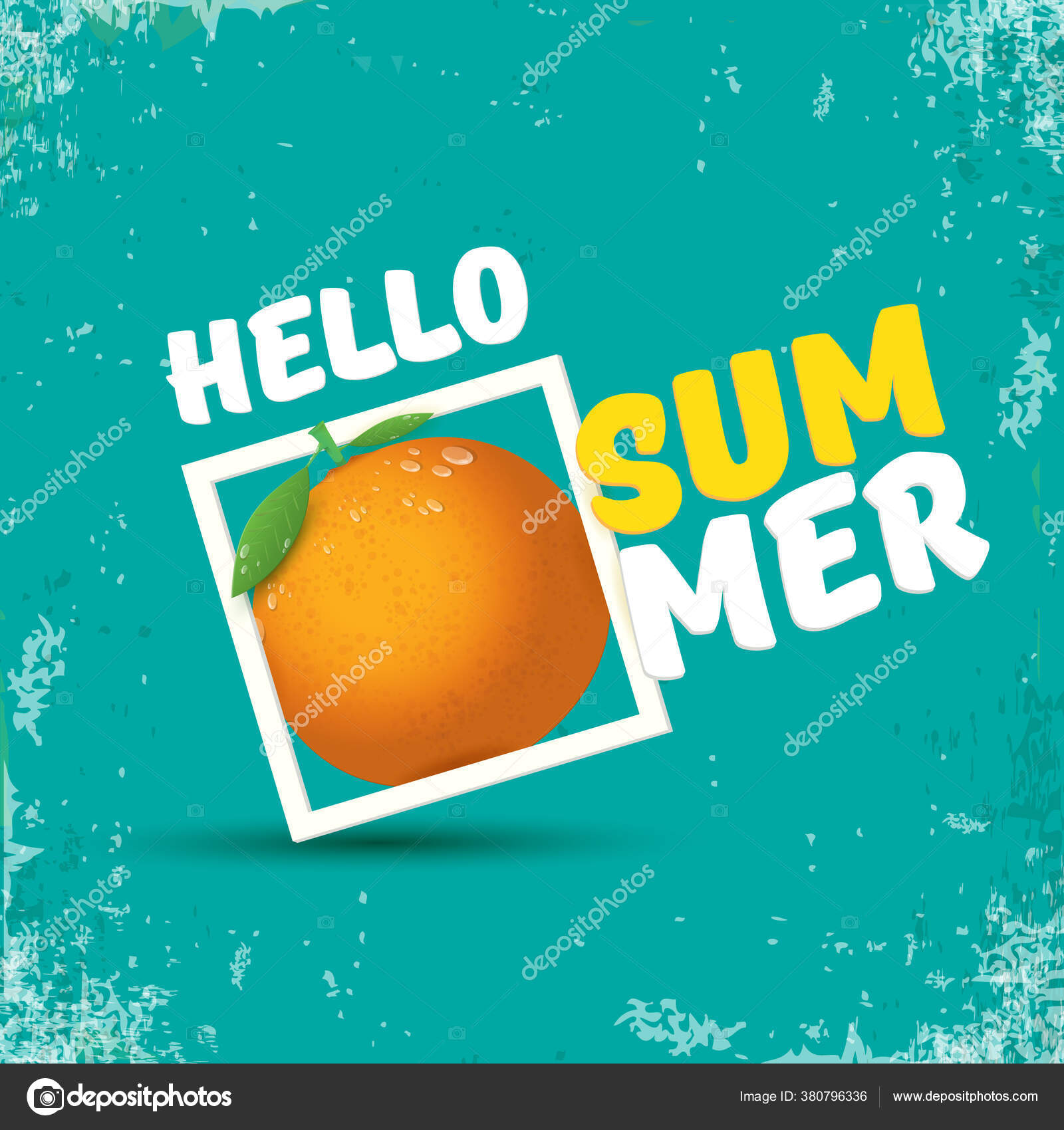 Vektor Hello Summer label pesta atau templat desain brosur dengan buah jeruk segar di latar belakang azure. Halo label konsep musim panas atau poster dengan teks buah dan letternig — Stok Vektor ©