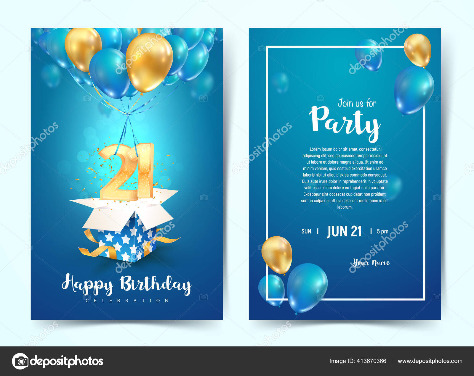Perayaan kartu undangan ulang tahun ke-21 tahun. Dua puluh satu tahun perayaan brosur. Templat dari undangan untuk pencetakan di latar belakang biru Stok Vektor © Olejio_NR #413670366