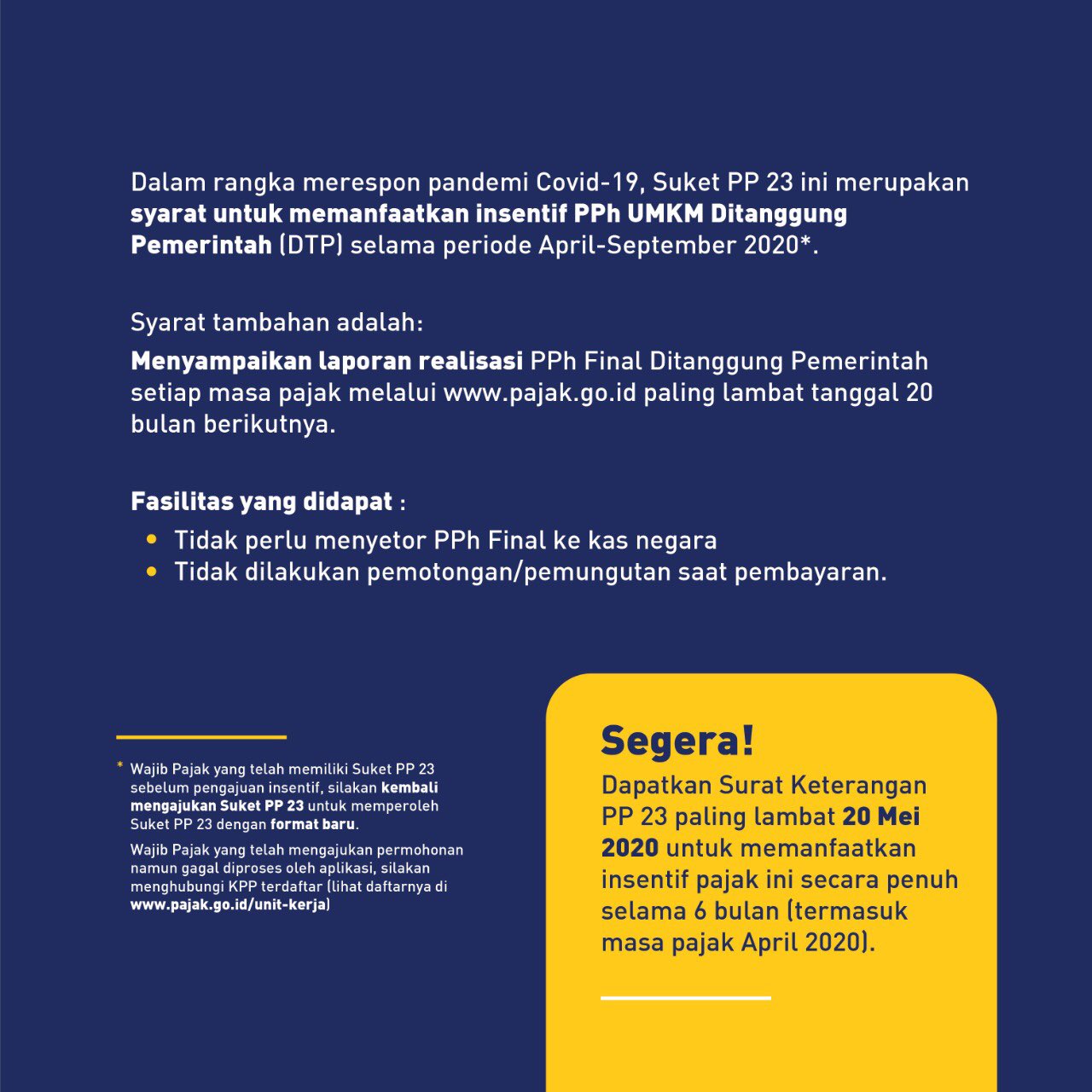 PajakKitaUntukKita on Twitter: “SUKET PP 23 ini merupakan syarat untuk memanfaatkan insentif PPh UMKM Ditanggung Pemerintah (DTP) selama periode April s.d. September 2020.… https://t.co/RtqUQMQzCY”