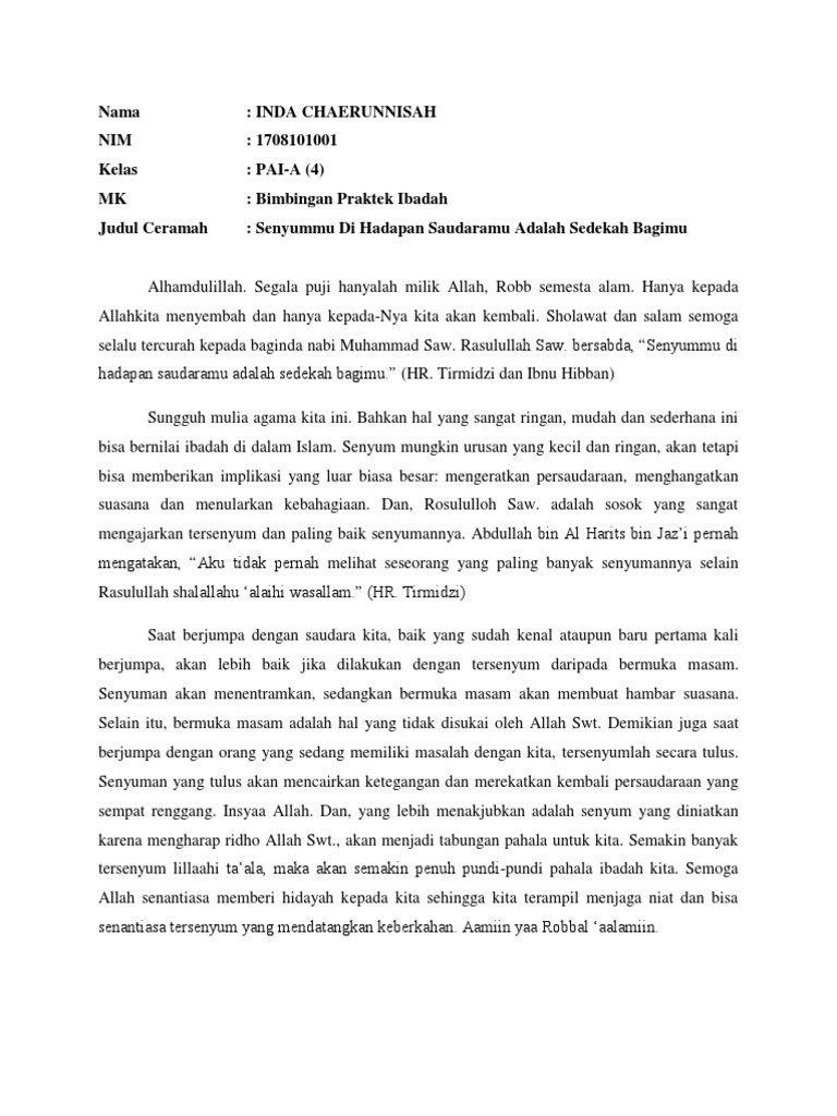 Contoh Ceramah Senyummu Di Hadapan Saudaramu Adalah Sedekah Bagimu Oleh Inda Chaerunnisah