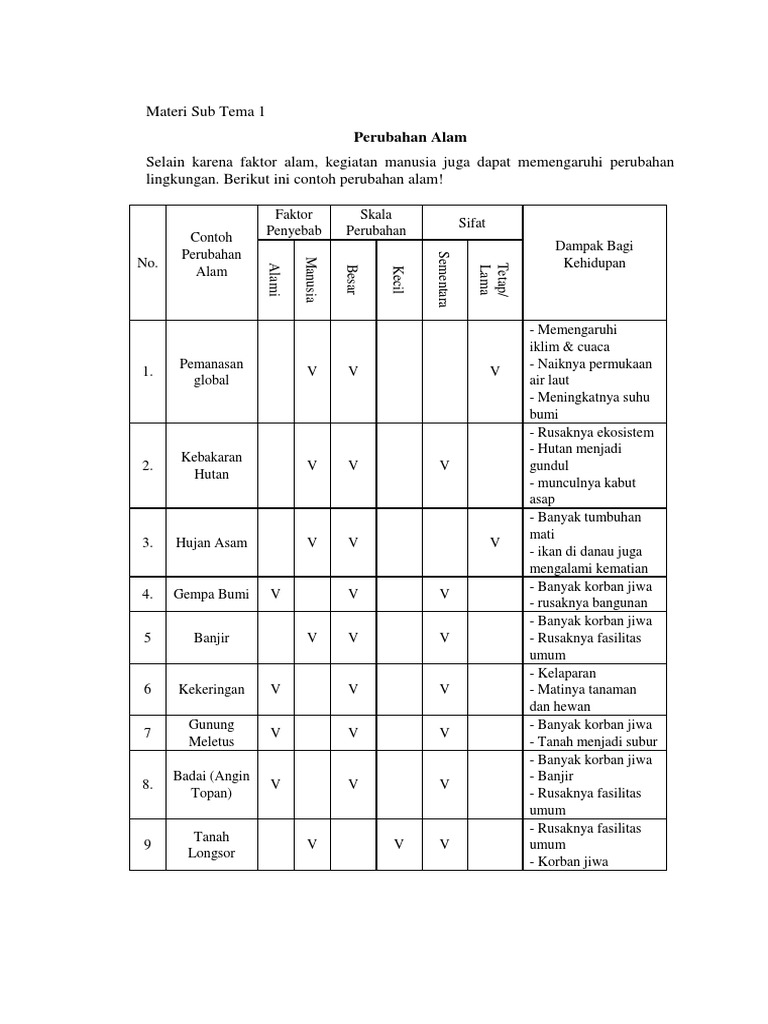 sebutkan contoh perubahan alam, faktor penyebab, skala serta sifatnya - Brainly.co.id