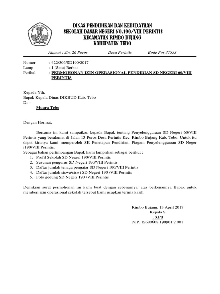 Contoh Surat Permohonan Izin Operasional Sekolah Dasar