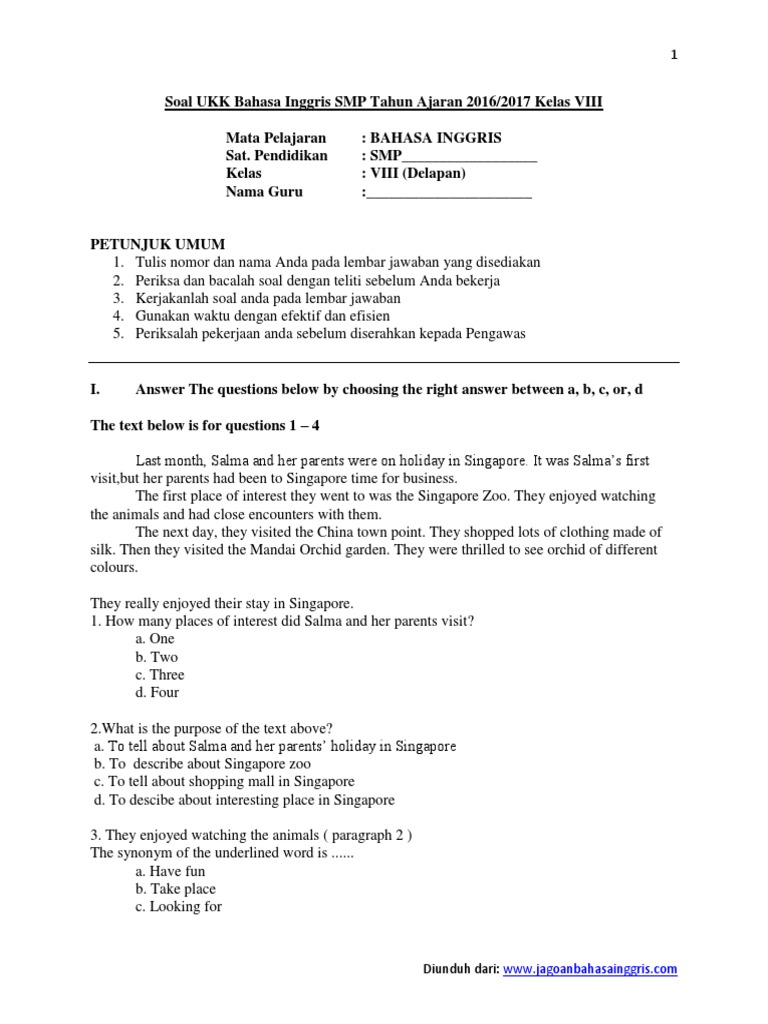 DOC) PAKET I CONTOH SOAL DAN PEMBAHASANNYA BAHASA INGGRIS SMP/MTS …