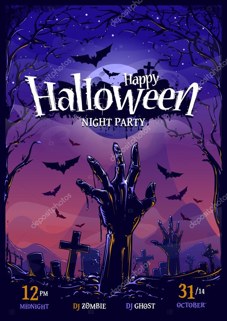 Halloween Party Poster With Zombie S Hand, House, Tree And Bats …