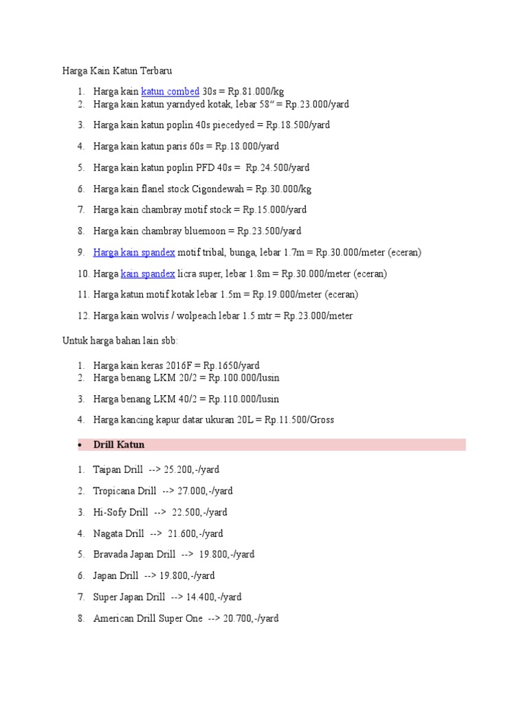 Daftar harga Kain Japan Drill Bulan Oktober 2020