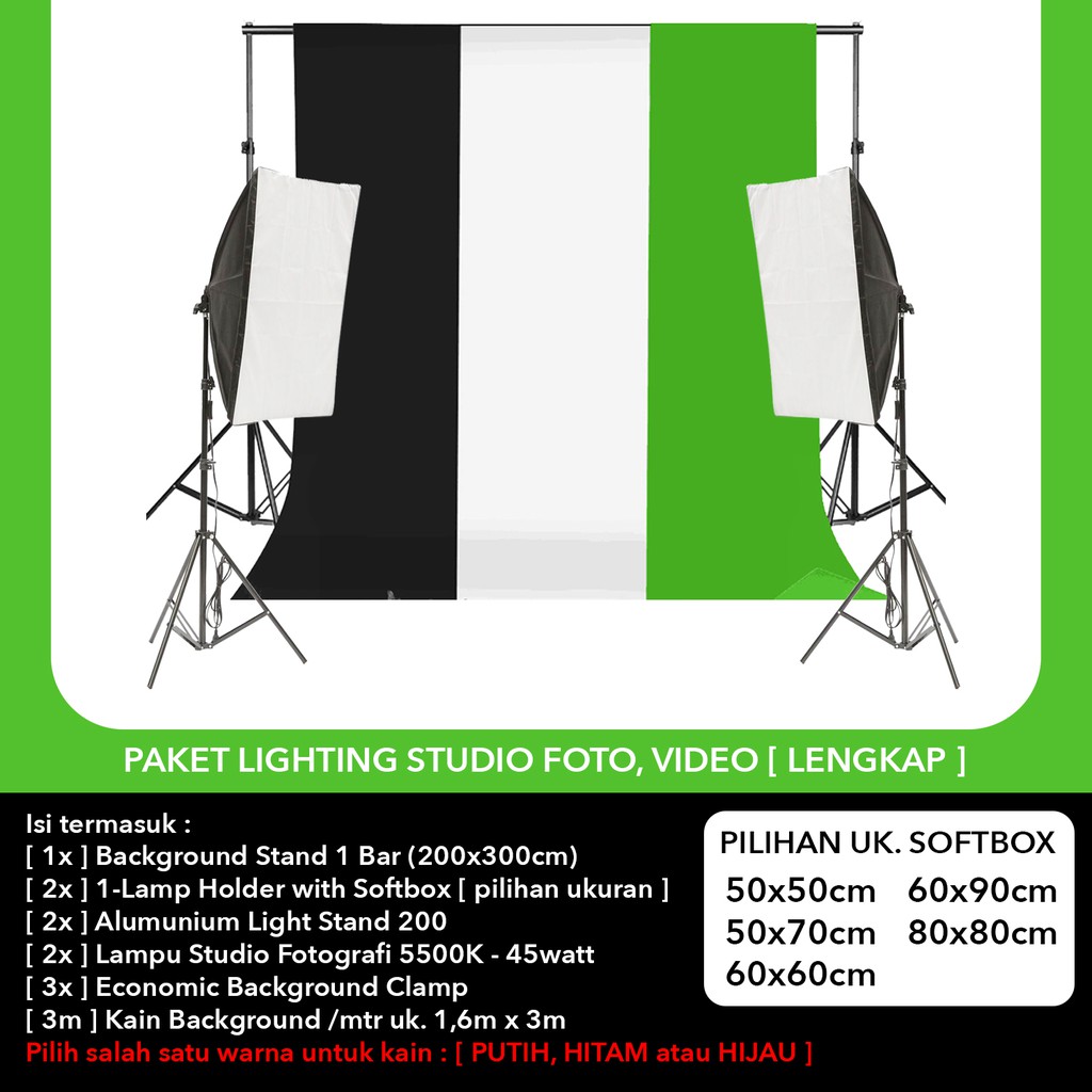 Paket Lampu Lighting Kain Background Hijau Green Screen - Backdrop Stand Bar Set 2x3m - Softbox Light Stand Studio di Lapak PUSAT PHOTOGRAPHY | Bukalapak