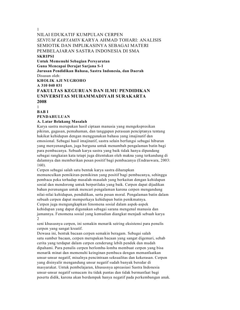 ANALIS NILAI-NILAI PENDIDIKAN PADA KUMPULAN CERPEN SENYUM KARYAMIN KARYA AHMAD TOHARI DAN SKENARIO PEMBELAJARANNYA DI KELAS X SM