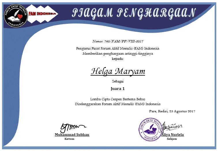 Helga Maryam, Terpilih Sebagai Juara 1 Lomba Cipta Cerpen Bertema …