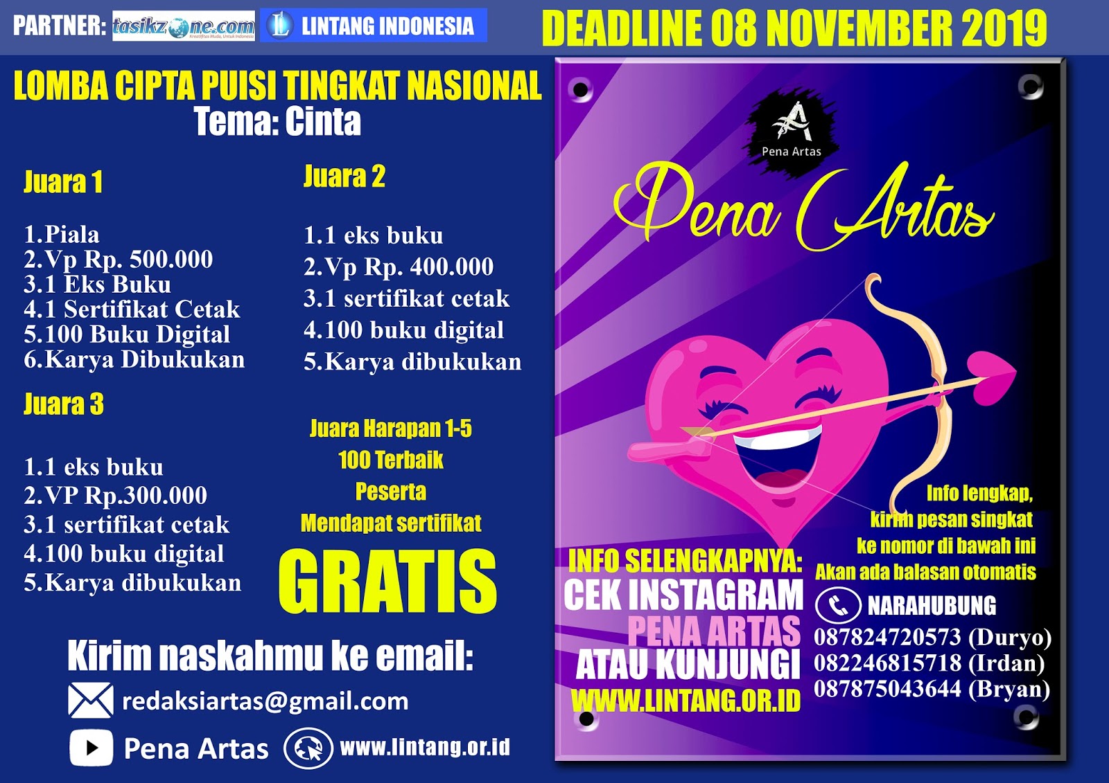 PENA ARTAS]- LOMBA MENULIS PUISI CINTA DAN MUSIKALISASI PUISI TINGKAT NASIONAL BERSAMA PENA ARTAS DAN LINTANG INDONESIA - LINTANG INDONESIA