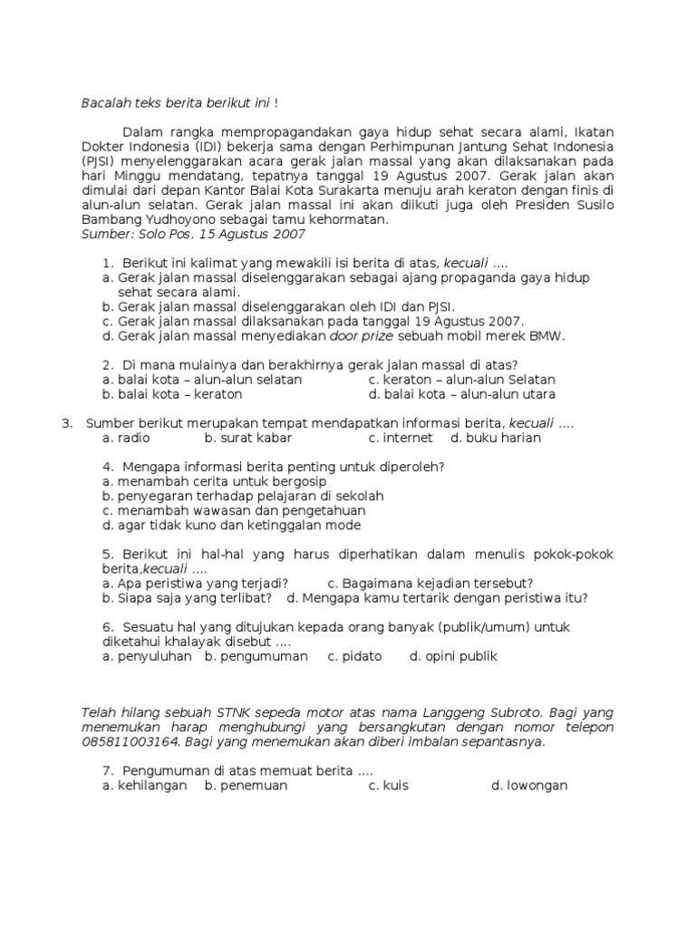 Soal Latihan Semester 1 B Indonesia Kelas 7 smp