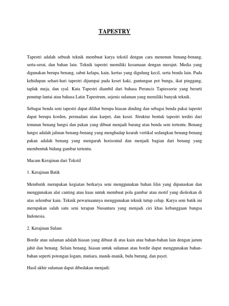 3. Jelaskan yang dimaksud dengan Tapestri, Batik,Sulam,Jahit …