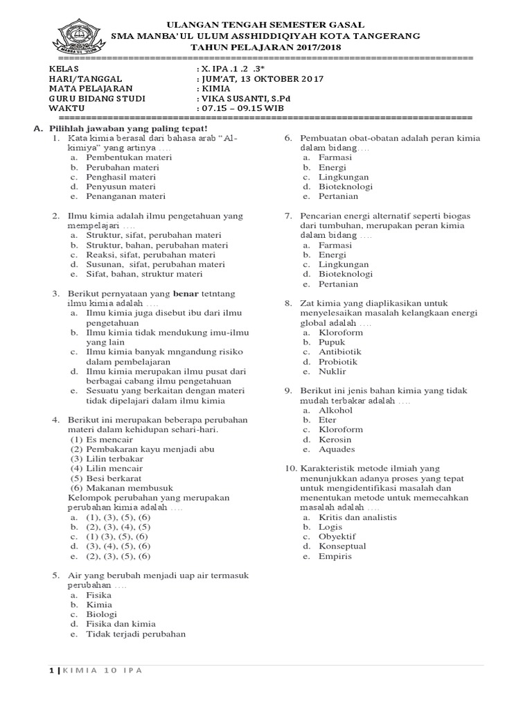Soal PAS Kimia X Semester 1