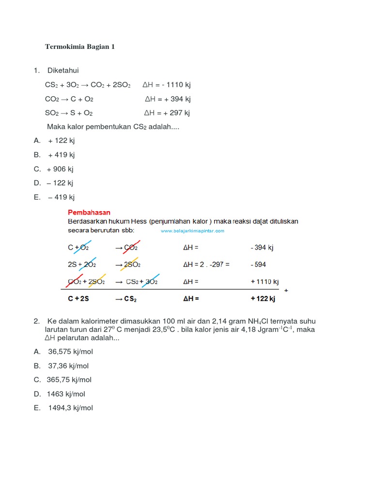 1 . Diantara perubahan materi berikut Entalpi pembentuk CS2. CO2 + 2 SO2 CS2 + 3 O2 H = +1110 kJ. C + O2 CO2 H = - 394 kJ 2S + 2O2 2SO2 H = - 594 kJ C + 2S CS2 H = +122 kJ - [PDF Document]