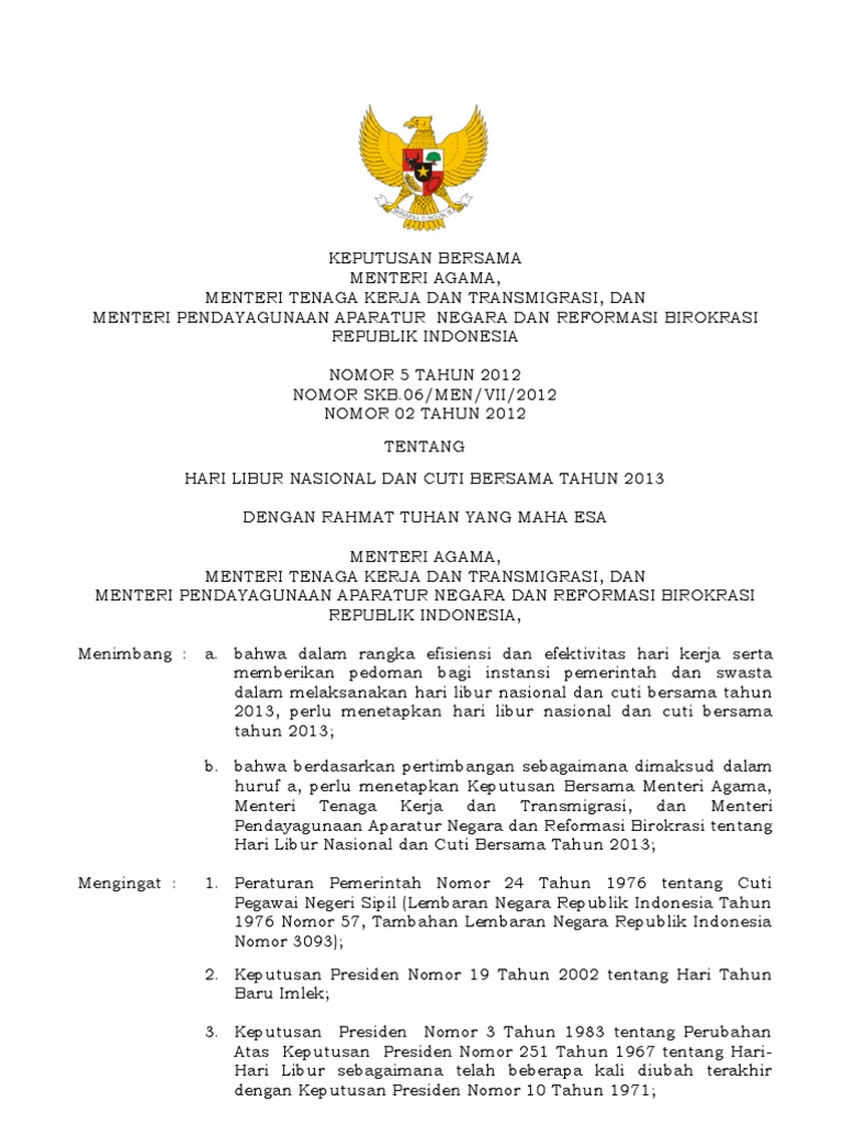 5 TAHUN 2012 SKB.06/MEN/VII/ TAHUN 2012 TENTANG HARI LIBUR NASIONAL DAN CUTI BERSAMA TAHUN 2013 DENGAN RAHMATTUHAN YANG MAHA ESA - PDF Free Download