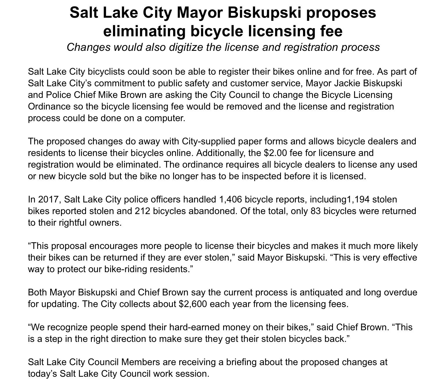 SLCgov on Twitter: “.@slcmayor proposes to eliminate #SLC bicycle licensing fee. Read more. #utpol @slcpd @ChiefMikeBrown… "
