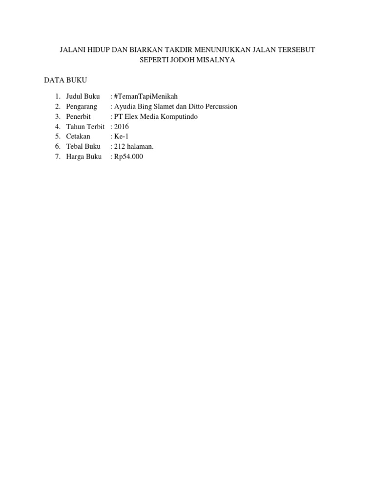 RESENSI NOVEL TEMAN TAPI MENIKAH OLEH AYUDIA BING SLAMET DAN DITTO PERCUSSION