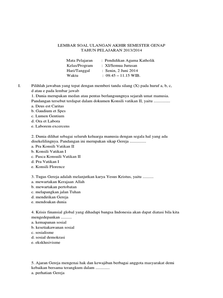 Soal Agama Katolik Kelas 12 Semester 1 Kurikulum 2013 - Guru Ilmu Sosial