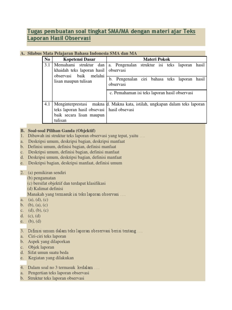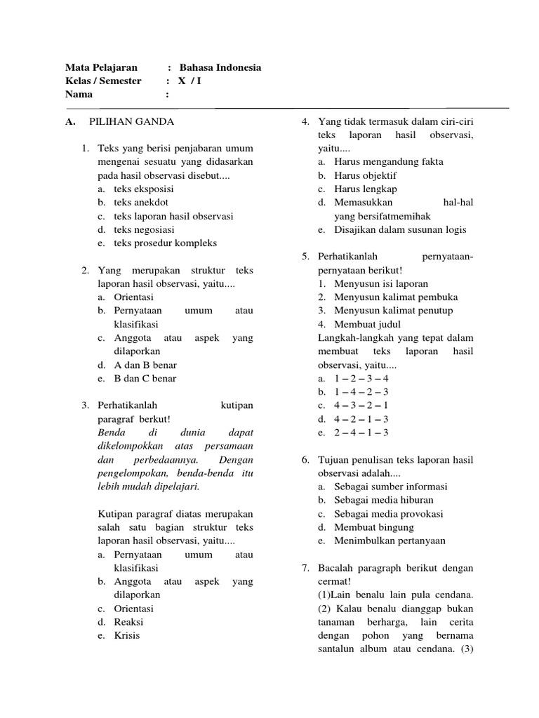 Soal Bahasa Indonesia Contoh Soal Teks Laporan Hasil Observasi Pilihan Ganda Untuk Pas