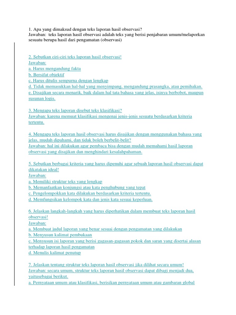 1. Apa yang dimaksud dengan teks laporan hasil observasi? Jawaban: teks laporan hasil observasi adalah teks yang berisi penjabaran umum/melaporkan sesuatu berupa hasil dari pengamatan (observasi)