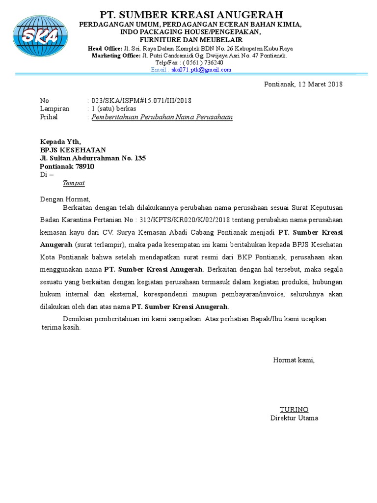 Contoh Surat Pemberitahuan Perubahan Nama Perusahaan – cute766
