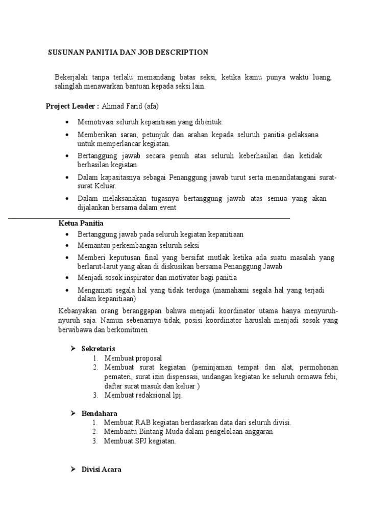 DOC) JOB DESRIPTION KEPANITIAAN EVENT | Pesta Elfrida - Academia.edu